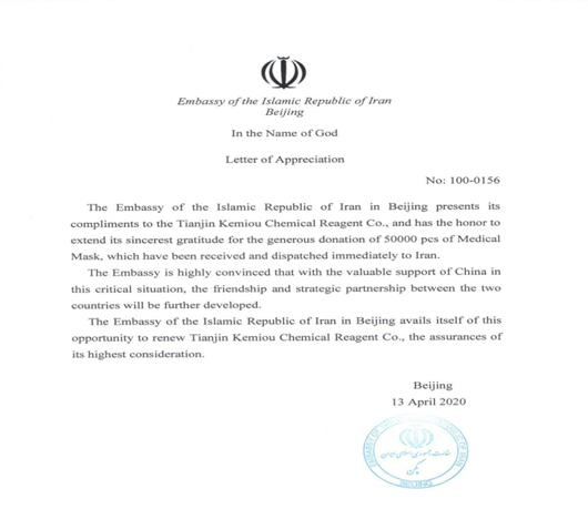 伊朗伊斯蘭共和國駐北京大使館,于2020年4月13日向天津市科密歐化學(xué)試劑有限公司發(fā)來一封題目為“以神的名義”的感謝信,對天津科密歐為他們慷慨捐贈的50000個醫(yī)用口罩表示以最誠摯的感謝。伊朗駐北京大使館表示:“借此機會重申對天津市科密歐化學(xué)試劑有限公司以最崇高的敬意!在這種危急的情況下有中國的寶貴支持,兩國的友誼和戰(zhàn)略伙伴關(guān)系將會有進(jìn)一步發(fā)展。”