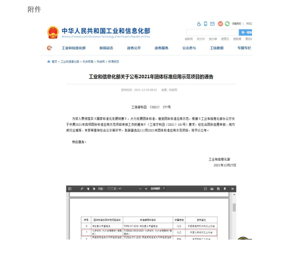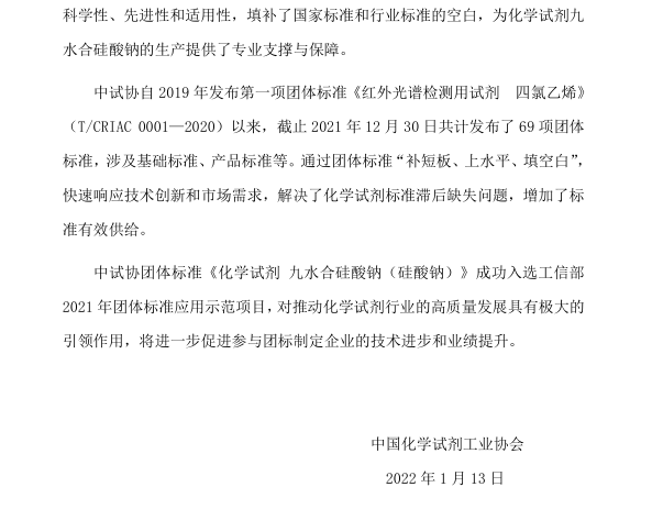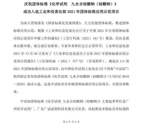 慶祝團體標準《化學試劑 九水合硅酸鈉(硅酸鈉)》 成功入選工業(yè)和信息化部2021年團體標準應用示范項目 (2022 第一期簡報))