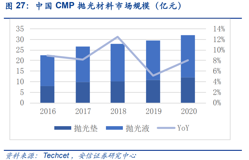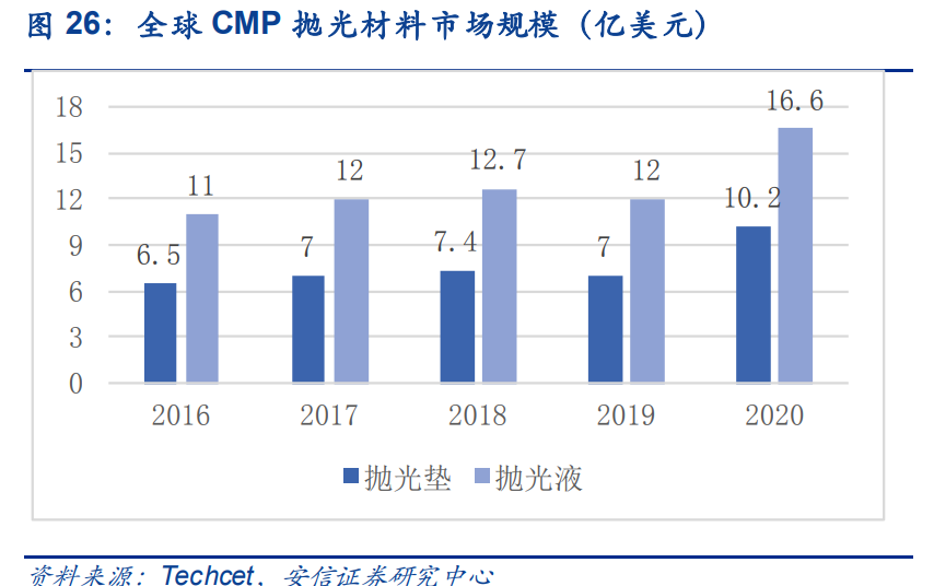 先進制程及工藝對晶圓平整度要求更高,拋光次數(shù)與材料種類等隨之增長,推動 CMP 材料用量逐年增長: