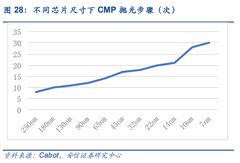 1)邏輯芯片中,制程的縮小帶動 CMP 工藝步驟增加。晶圓在生產(chǎn)過程根據(jù)不同工藝制程和技術(shù)節(jié)點的要求,會經(jīng)歷幾道至幾十道不等的 CMP 工藝步驟。隨著制造工藝節(jié)點的縮小,對邏輯芯片平坦化程度要求提高,演進出的先進邏輯芯片工藝拋光材料提出新需求,CMP步驟增加,CMP 材料需求量增大。據(jù) Cabot 披露,先進制程 7nm 工藝的 CMP 步驟為 30步,成熟制程 90nm 工藝 CMP 步驟為 12 步,拋光次數(shù)倍數(shù)級增長,制程節(jié)點的進步推動 CMP 拋光材料需求量的增長。